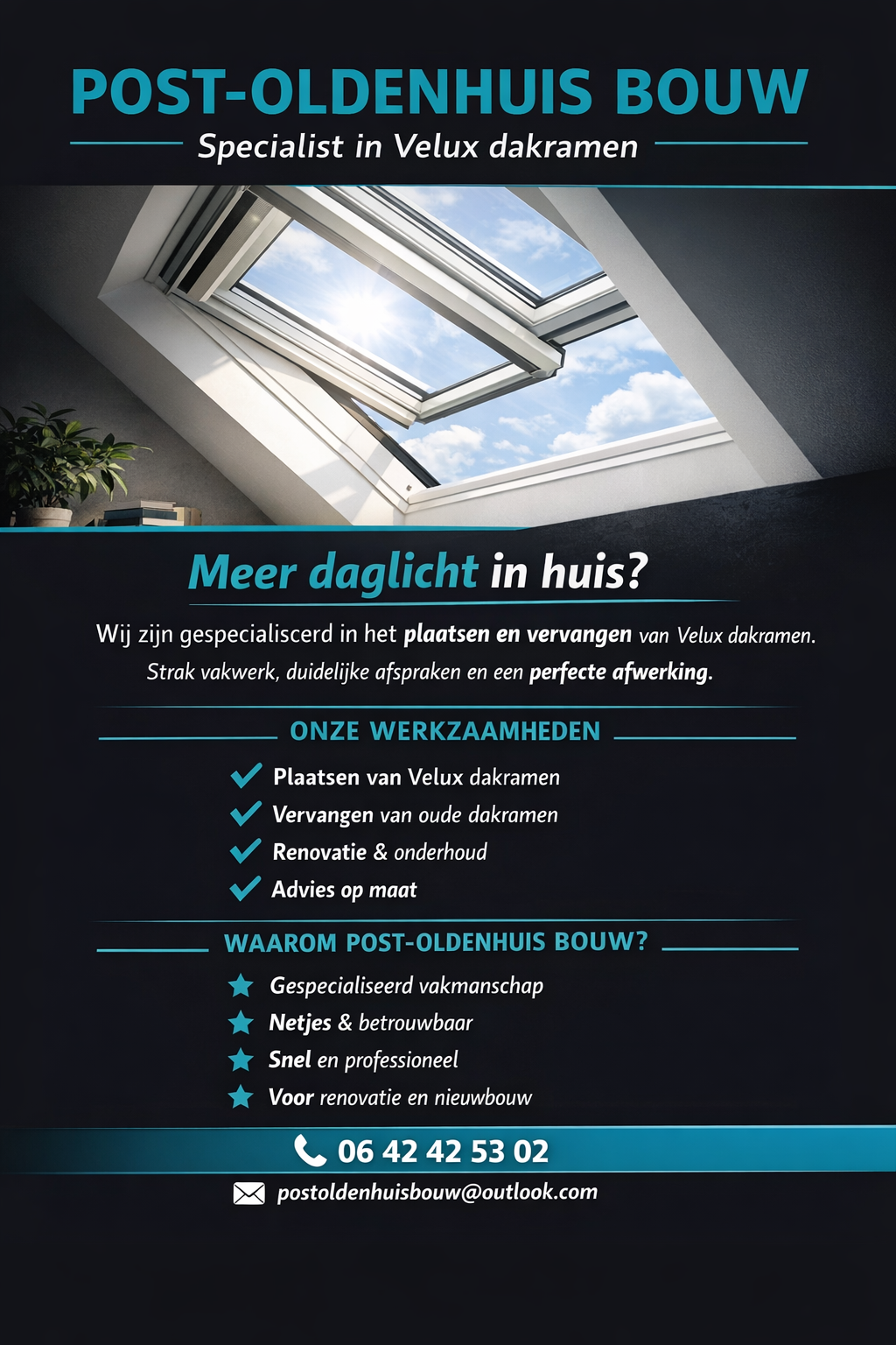 Bij Post-Oldenhuis Bouw, gevestigd in Emmen , Nederland, zijn we volledig gespecialiseerd in de verkoop en montage van Velux dakramen. Als een gloednieuw bedrijf brengen we jarenlange ervaring en een frisse blik op service met ons mee. We staan klaar om uw project, groot of klein, met expertise en toewijding te realiseren.